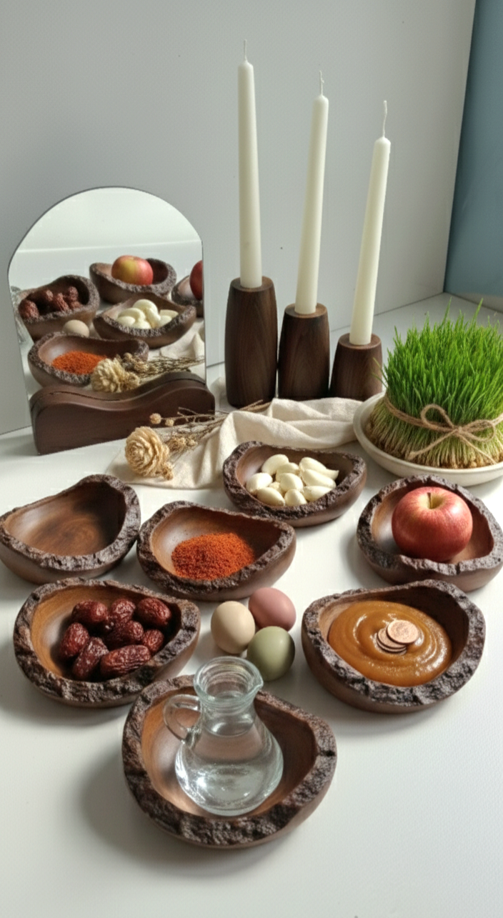 ست هفت سین ۱۱ پارچه لوکس مدل افرا (ترکیب روستیک و شمعدان ۳ تایی) | شمع سنگ مینا